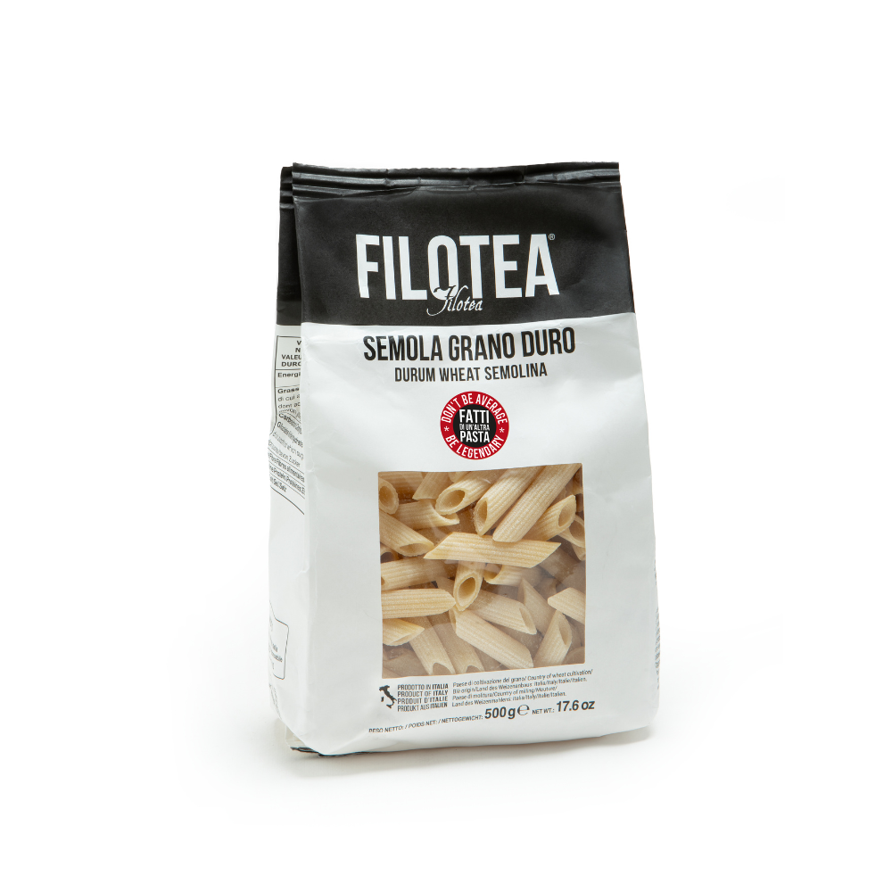Unlike common commercial pasta, Filotea Rigatoni are produced using the bronze drawing technique, which makes them even more porous and able to retain sauces.